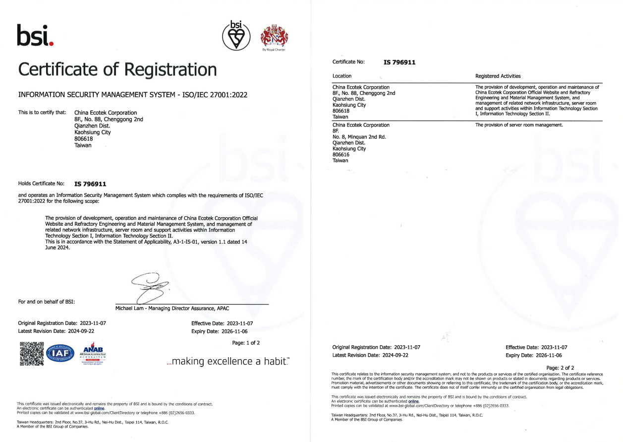 | 本公司通過ISO 27001資訊安全管理系統國際認證,證書有效期間至2026年11月6日。 |